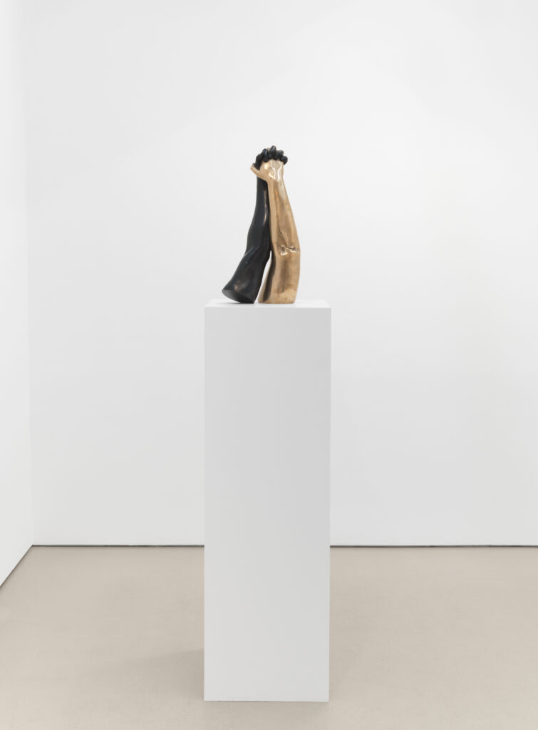 A sculpture of two arms on a white pedestal. The middle of the bicep of each arm extends upward from the pedestal. One arm is finished with black patina, while the other is finished with polished bronze, appearing gold. At the top of the sculpture, the hands are clasped together.