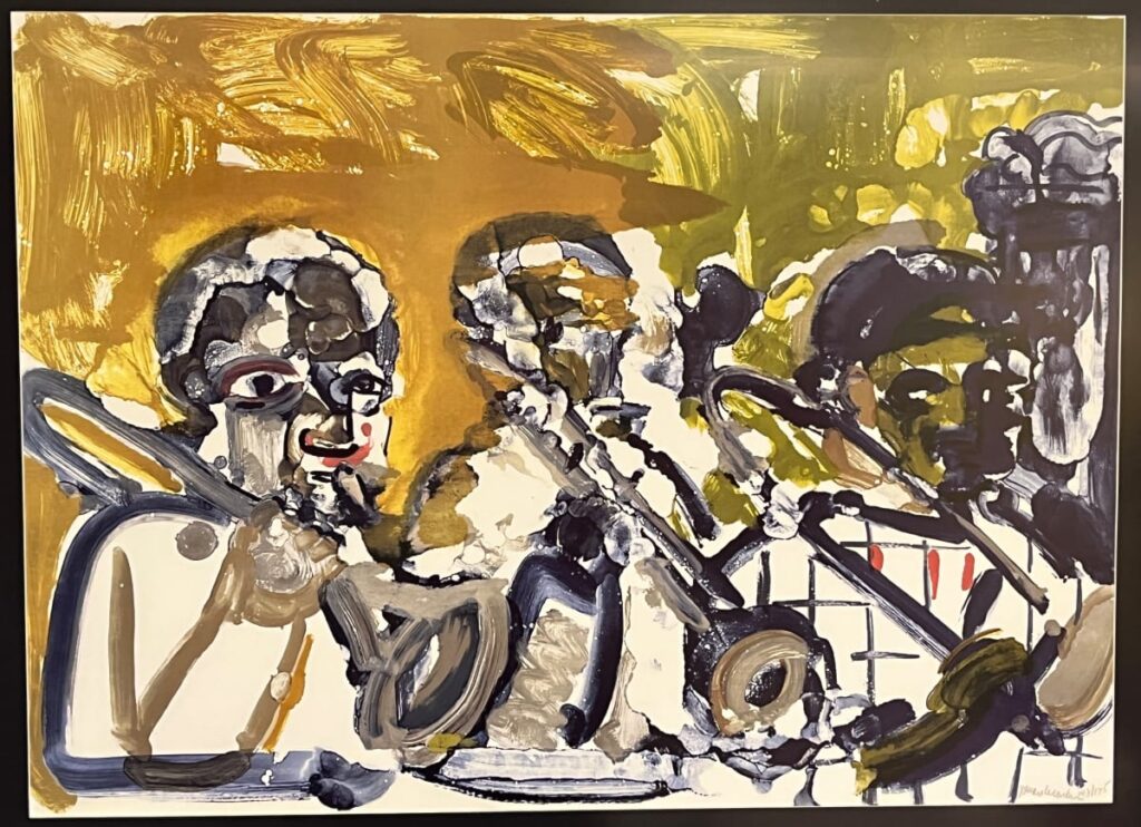 Through Brass Section and numerous other works, Romare Bearden was an artist who left an indelible mark on the jazz scene and a notable impression on popular music as a whole. For example, the fact that his recognition even extends to contemporary hip-hop artists (i.e., The Roots) is further proof of rap’s jazz lineage. His contributions to creatively depicting jazz musicians were only part of his larger mission of addressing what it was to be African-American in the United States, oftentimes in the contentious historical South, where he once called home. The Brass Section’s subject of a New York jazz club contributes to the discourse by mimicking the energy rather than the visual details of jazz and its musicians, a music tradition deeply tied to its origins in African-American communities. To capture this energy, as Bearden often did, is a testament to his excellent understanding of visual art, music, and the surrounding community.